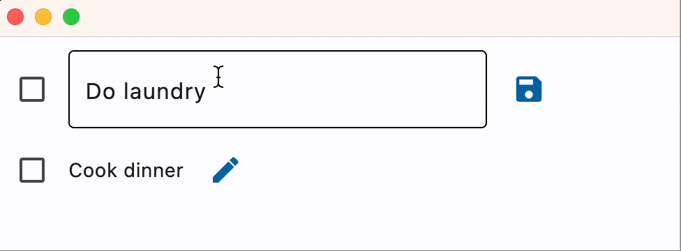 Composite custom controls inherit from container controls such as Column, Row, Stack or even View to combine multiple Flet controls. The example below is a Task control that can be used in a To-Do app: